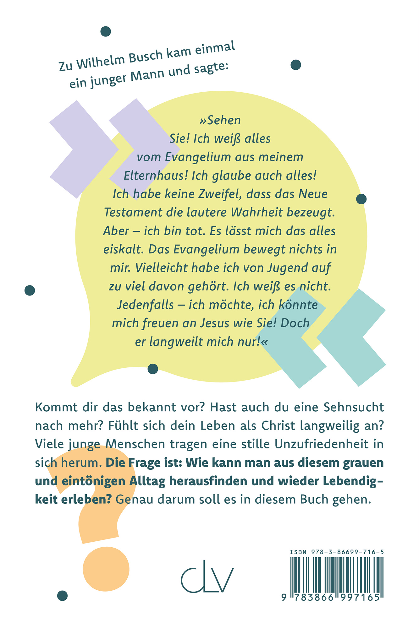 Kommt dir das bekannt vor? Hast auch du eine Sehnsucht nach mehr? Fühlt sich dein Leben als Christ langweilig an? Viele junge Menschen tragen eine stille Unzufriedenheit in sich herum. Die Frage ist: Wie kann man aus diesem grauen und eintönigen Alltag herausfinden und wieder Lebendigkeit erleben? Genau darum soll es in diesem Buch gehen.